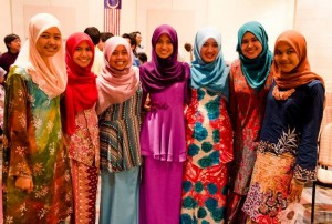 Umar and Iman, our adorably energetic MCs of the night, explained the traditional Malaysian outfits they wore. Umar modeled his baju melayu, the full outfit for men; his samping, the cloth wrapped around his waist; and his songkok, a black hat which reminded me of Abu’s hat from Aladdin. Iman showed off her dress, called the baju kurung, and her hijab, the head covering which she wears for religious Muslim, rather than cultural, practice.