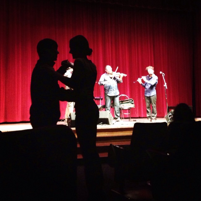 The feature was Genticorum, a three-man band from Québec. The band includes Yann Falquet on the guitar and jaw harp; Alexandre de Grosbois-Garand on the wooden flute, electric bass, fiddle; and Pascal Gemme, playing the fiddle and stomping his feet. All three sing as well, which made for some beautiful a capella songs. The foot-stomping was especially exciting.